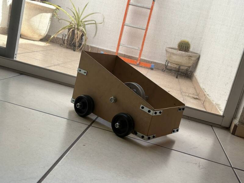 La estructura principal del vehículo se construyó utilizando cartón rígido o madera ligera, materiales elegidos por su equilibrio entre resistencia y bajo peso, crucial para la eficiencia del movimiento. Como se puede observar, el ensamblaje se reforzó en los puntos críticos.